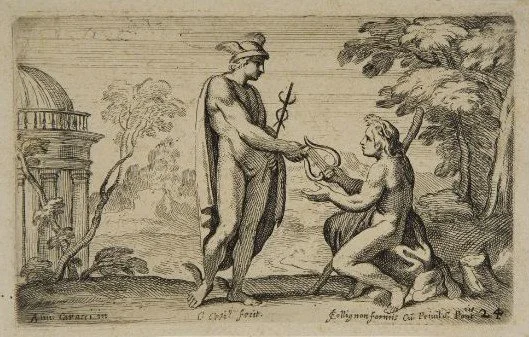 Mercury standing holding a lyre with Apollo seated before him; after Annibale Carracci. c.1640s Etching